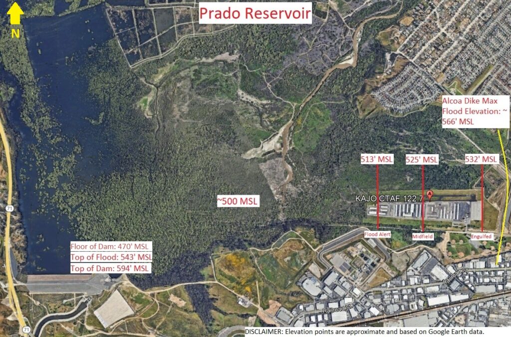 The Corona Municipal Airport (KAJO) sits inside this Prado flood basin on relatively low ground. Because of that location, parts of the airport have been flooded in recent decades during periods of heavy rainfall, when rising reservoir levels spread across the basin floor—one of the reasons why airport tenants should monitor the Prado water levels.